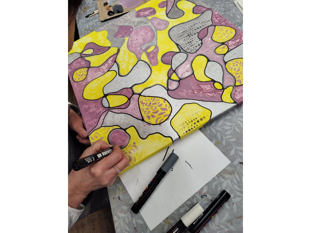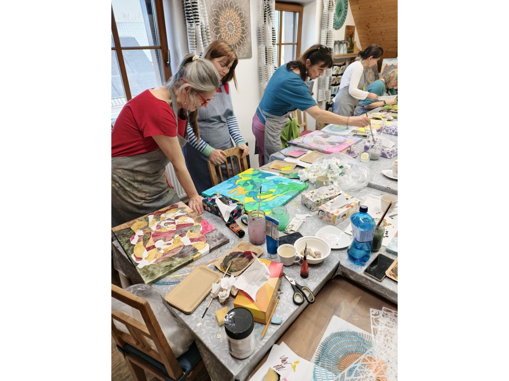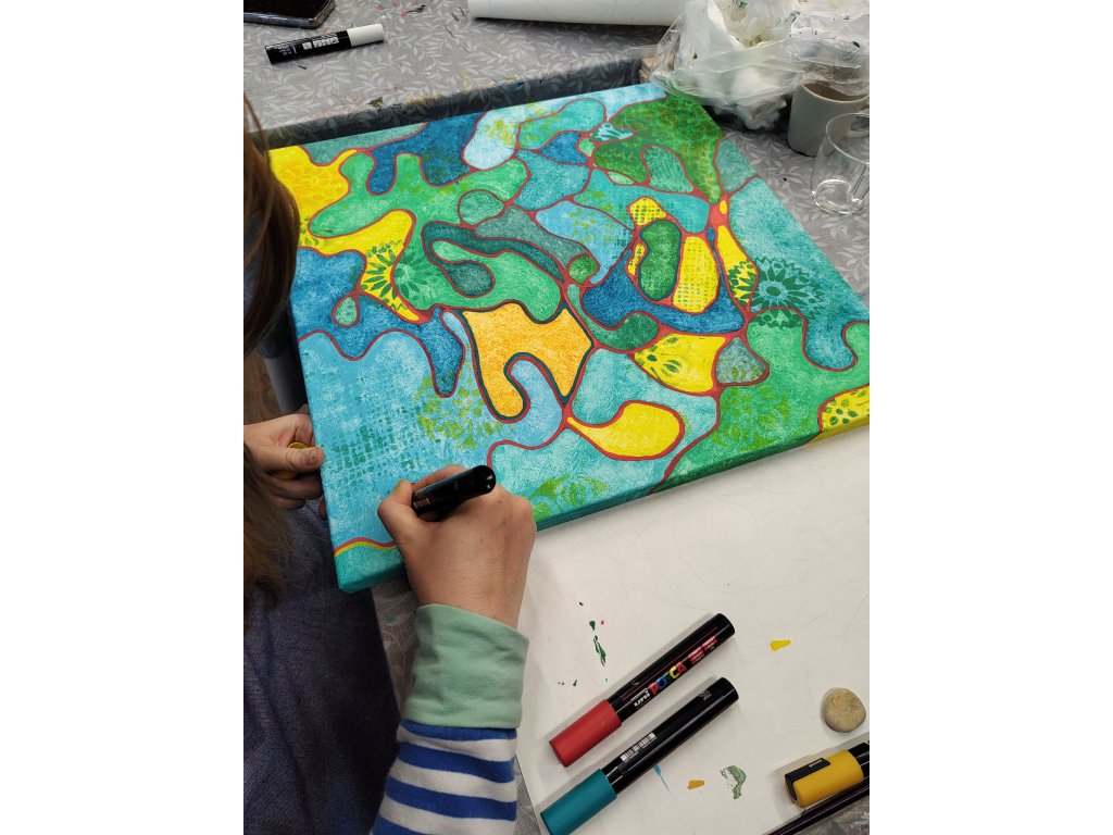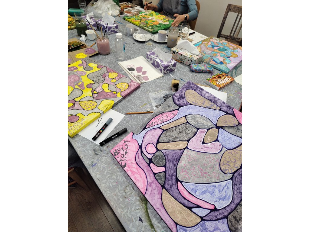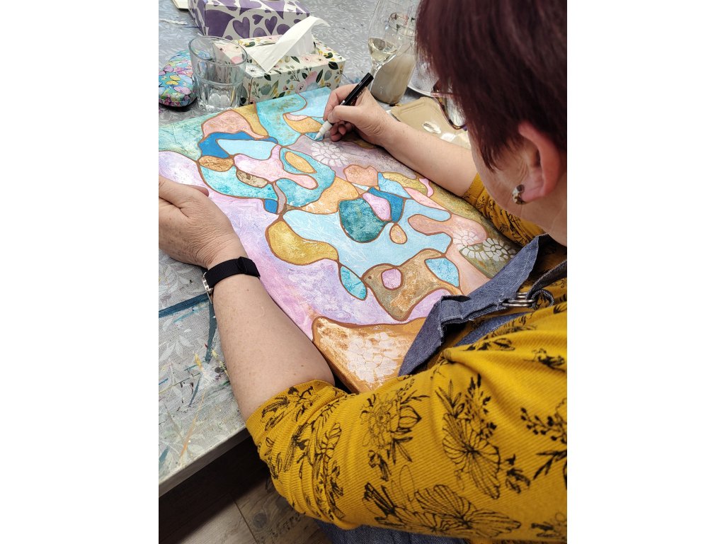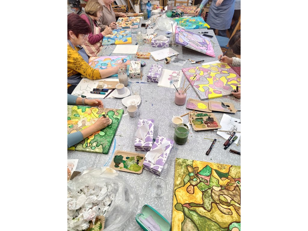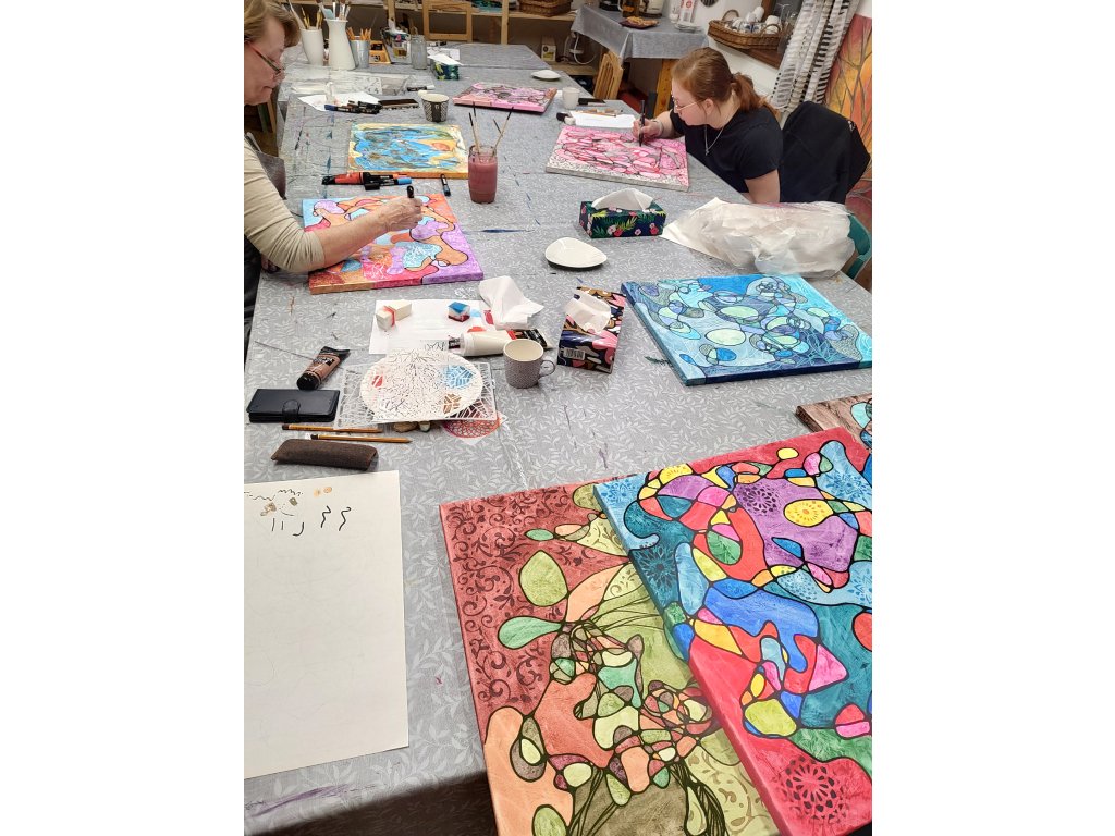 - V ceně: Veškerý materiál (plátno, barvy, fixy, šablony), zástěra k zapůjčení, káva, čaj a domácí pohoštění.