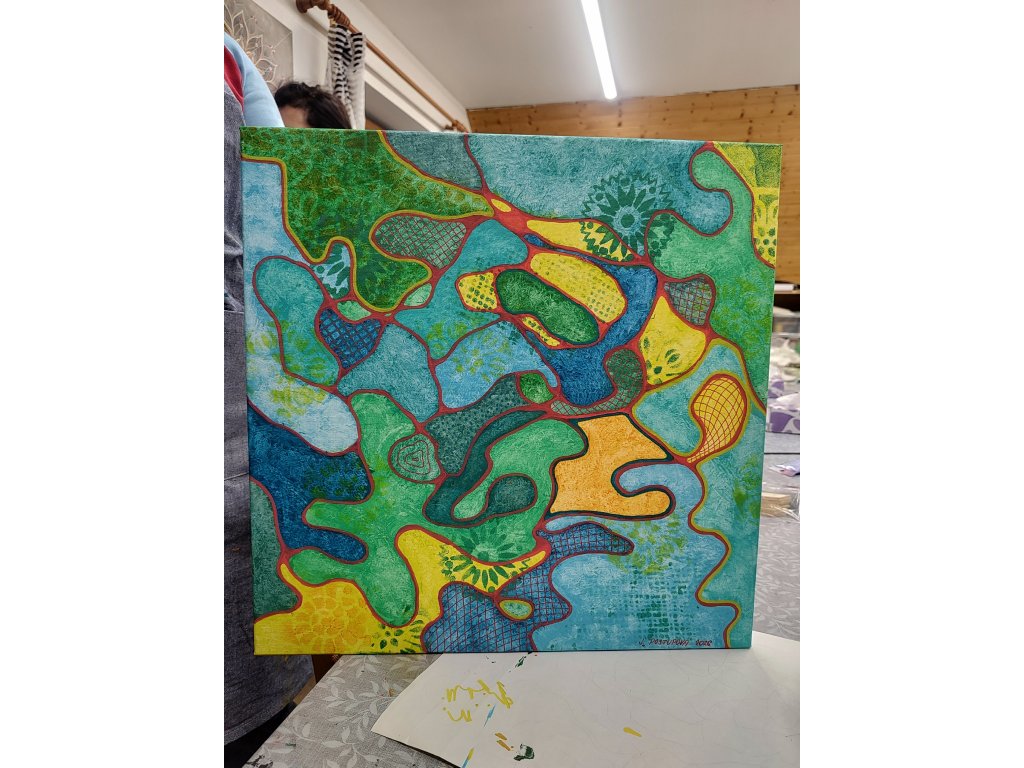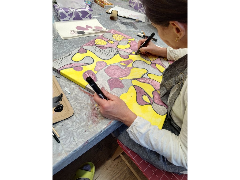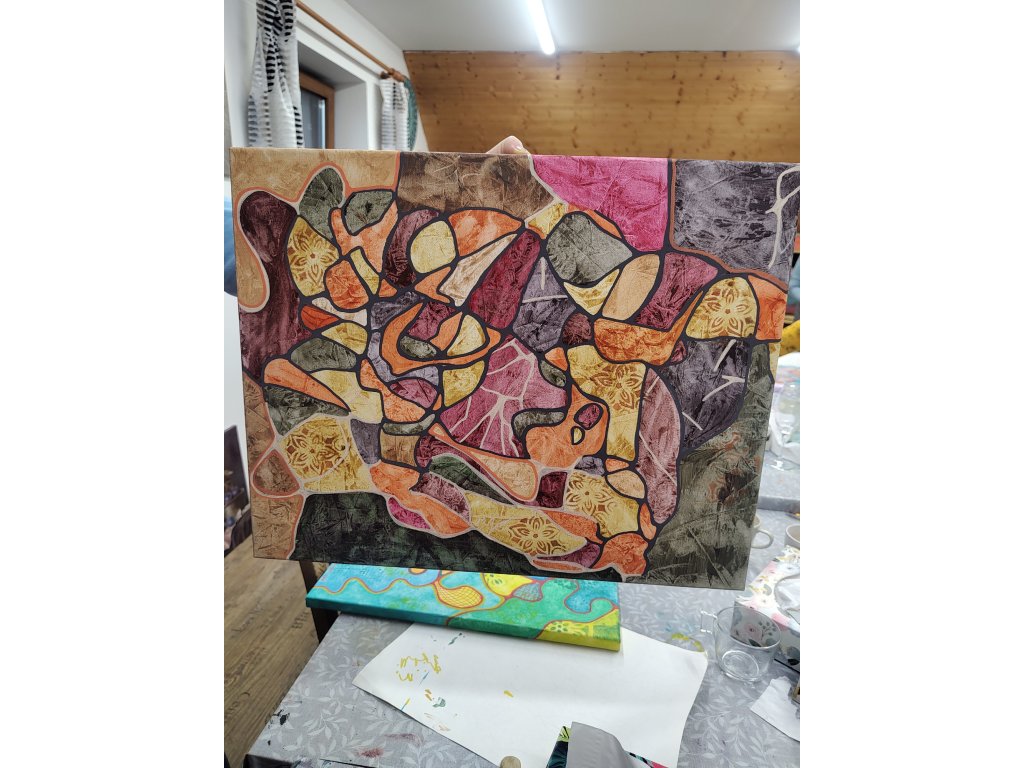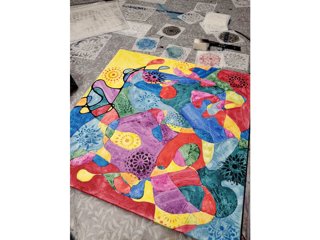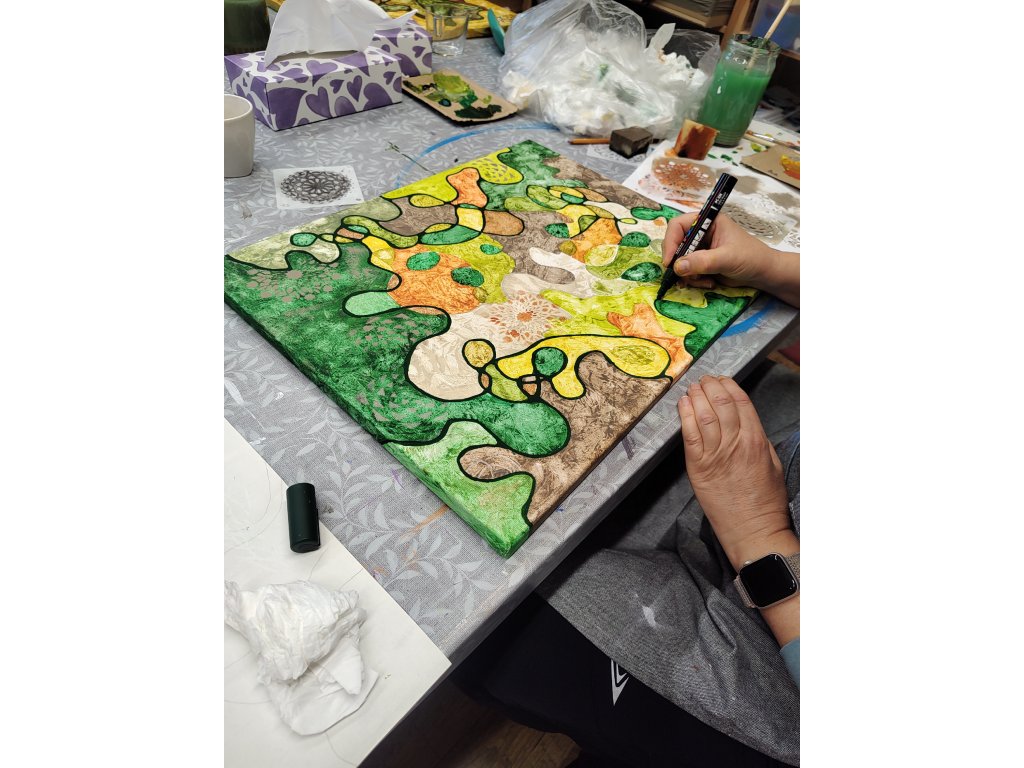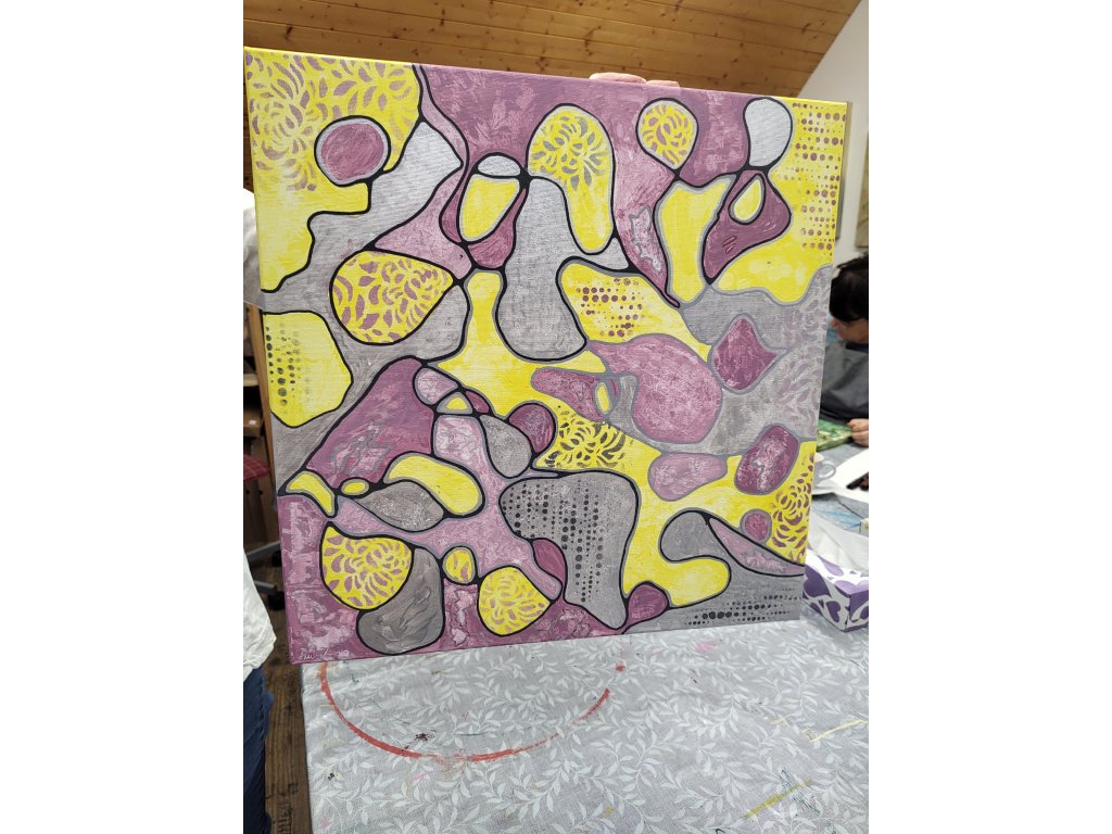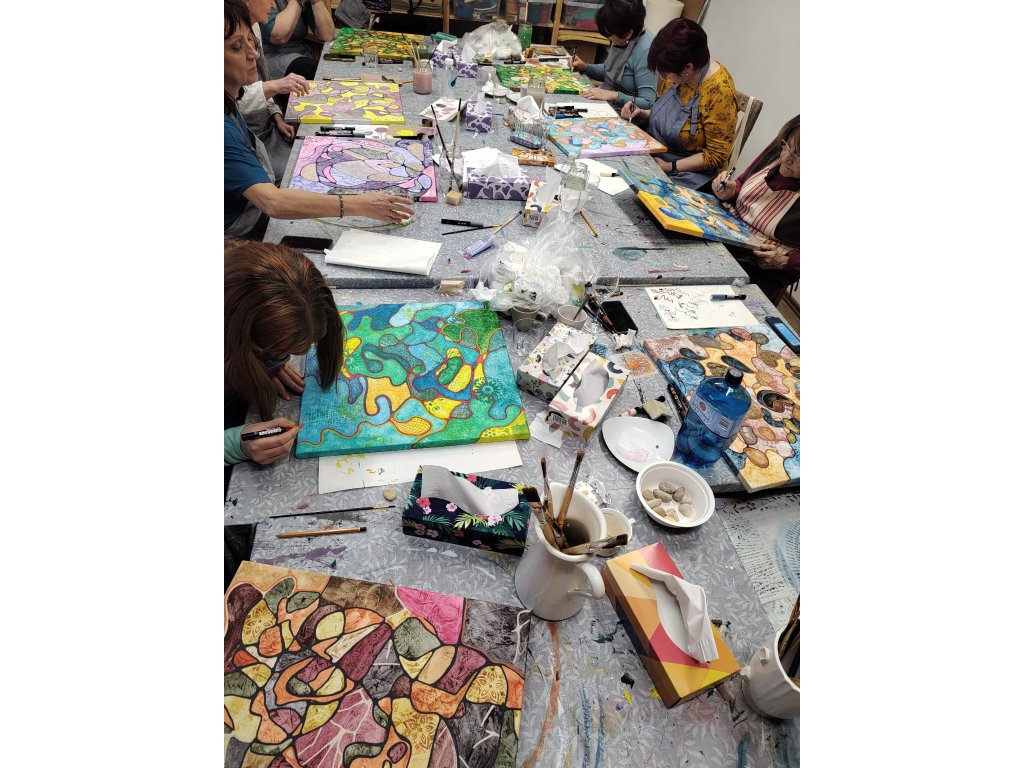 - V ceně: Veškerý materiál (plátno, barvy, fixy, šablony), zástěra k zapůjčení, káva, čaj a domácí pohoštění.
