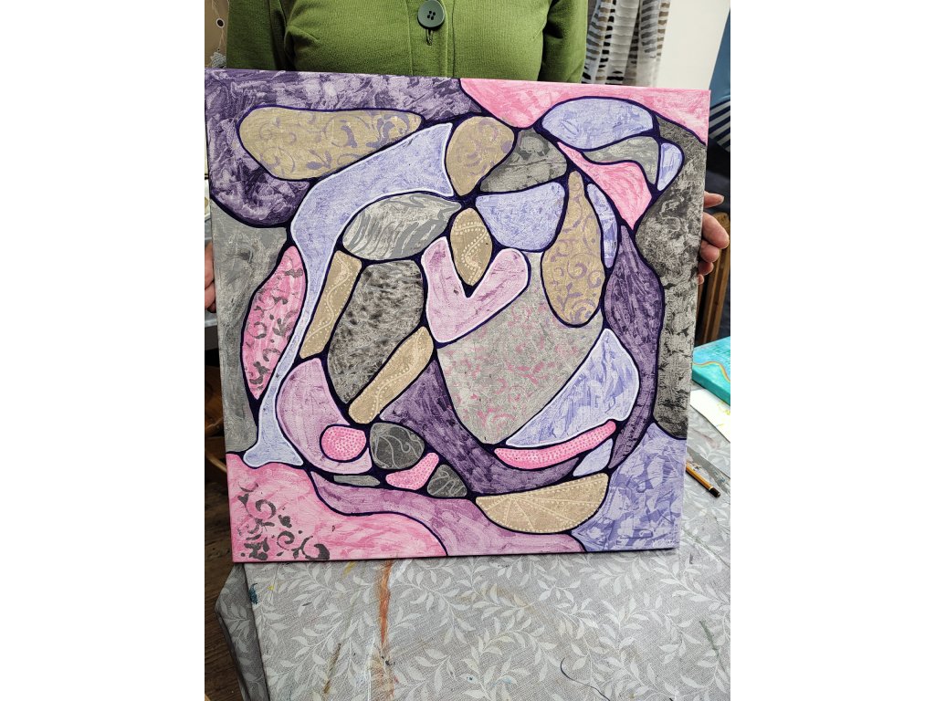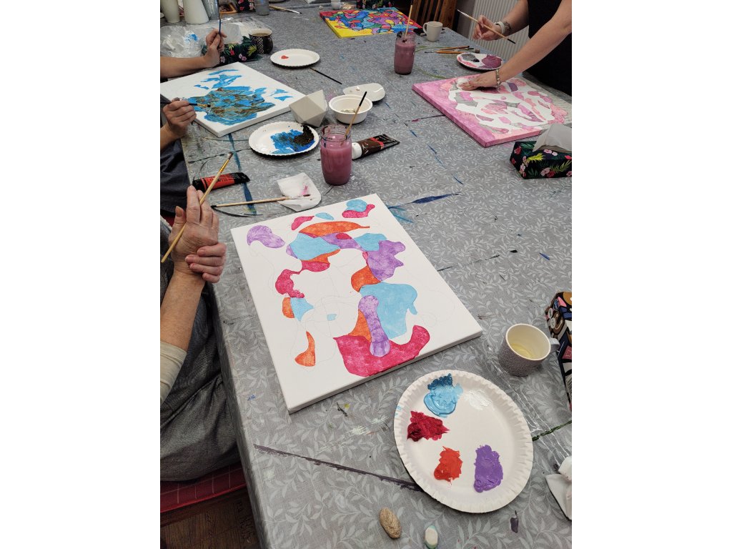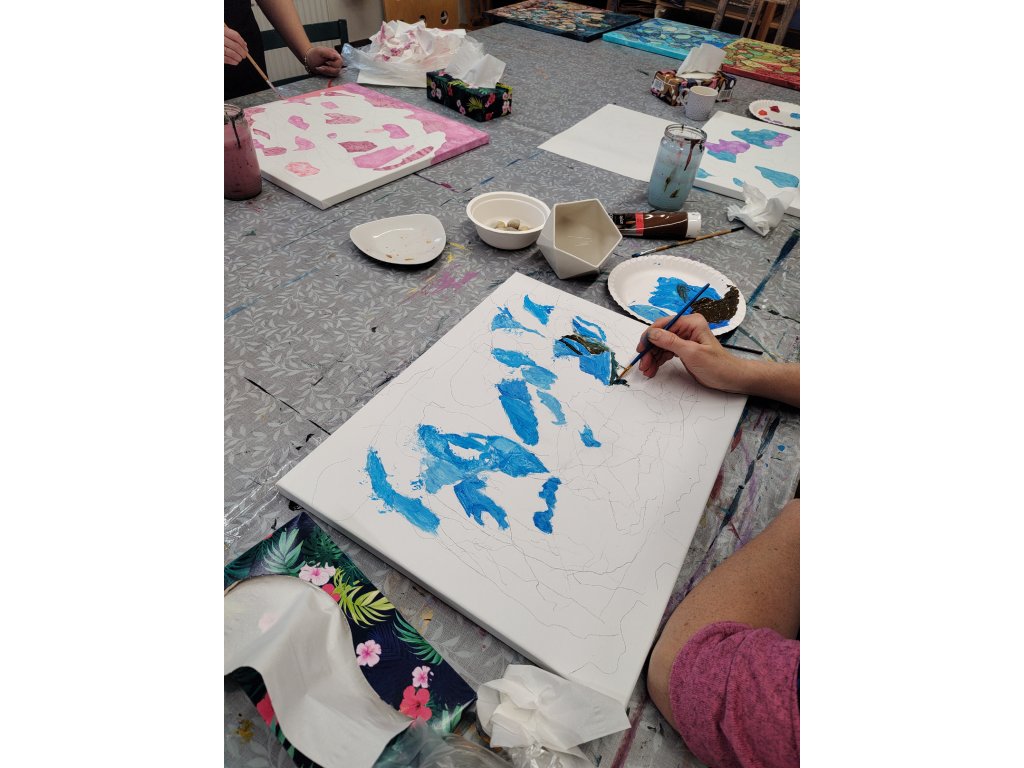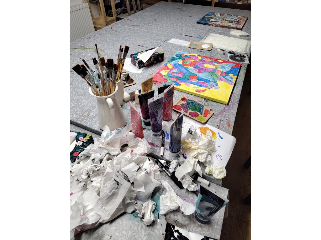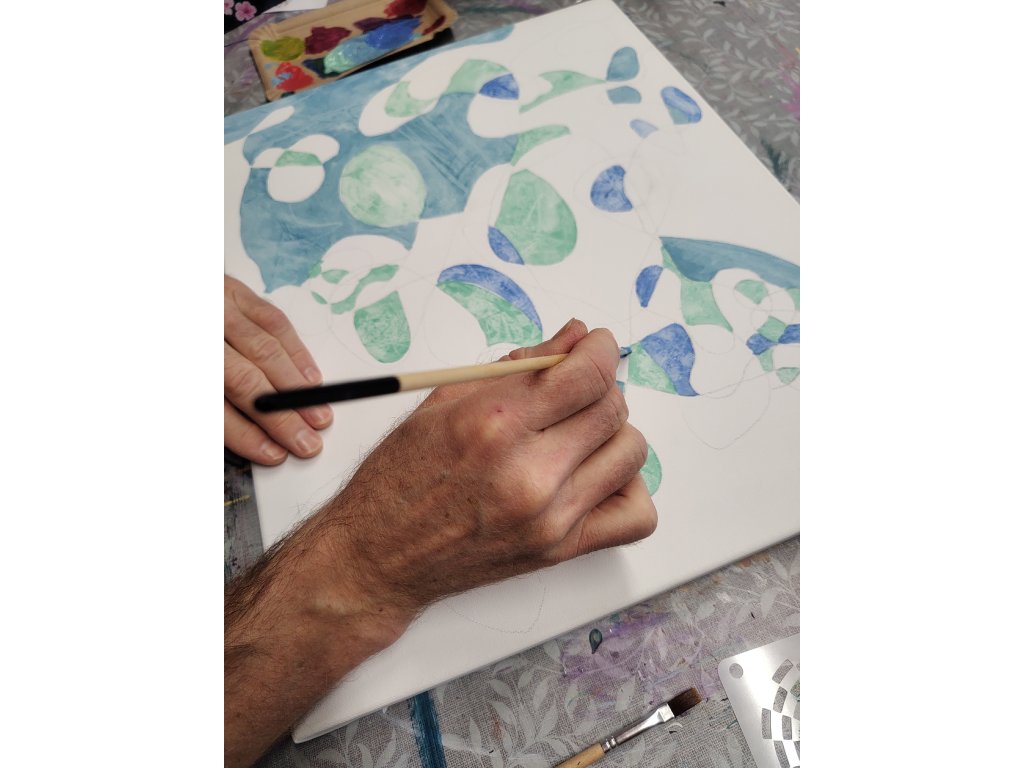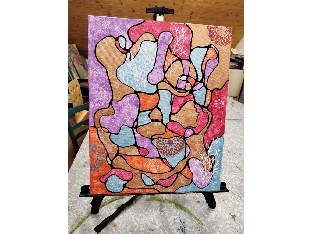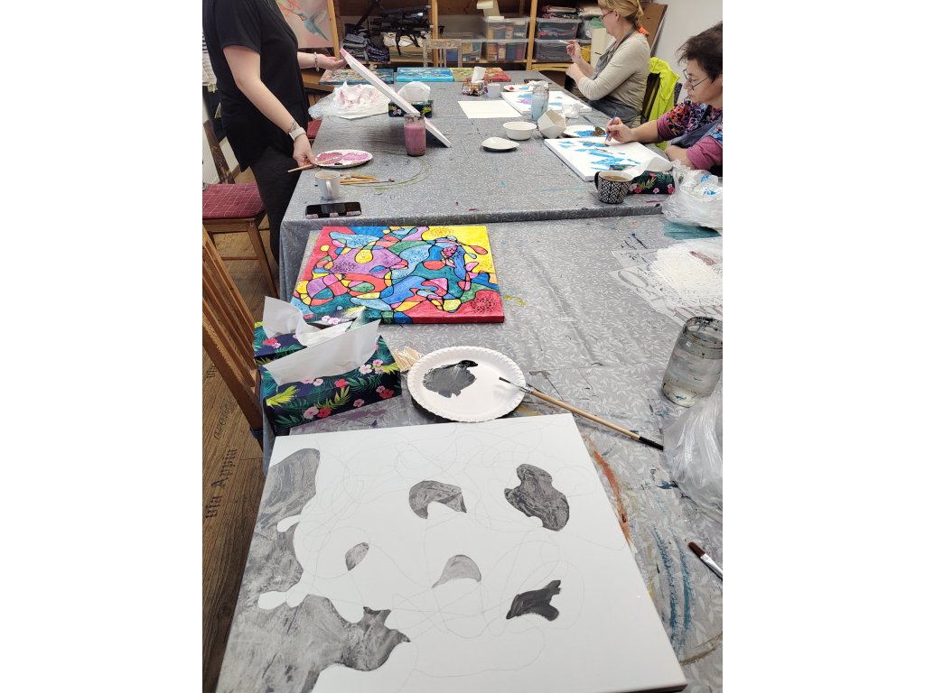 - V ceně: Veškerý materiál (plátno, barvy, fixy, šablony), zástěra k zapůjčení, káva, čaj a domácí pohoštění.