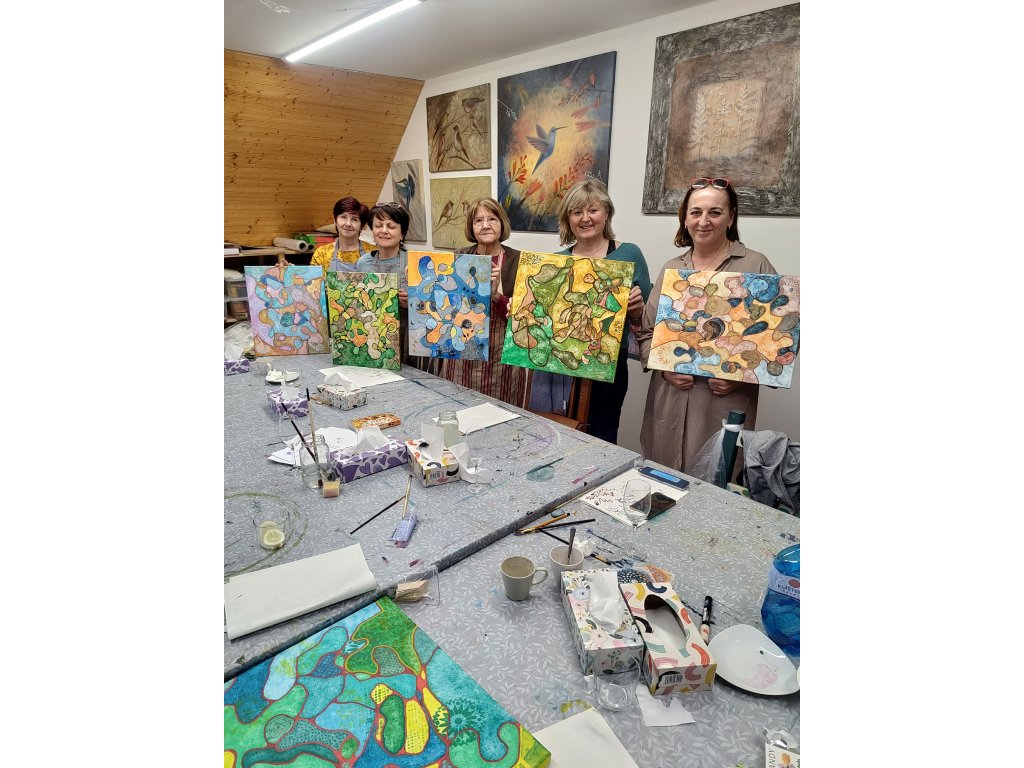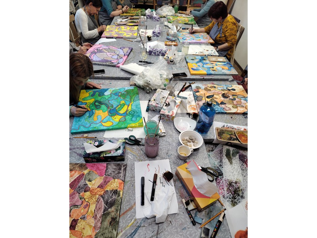 - Tento pětihodinový blok je navržen tak, aby vás nabil novou energií. Vypnete hlavu, uvolníte ruku a domů si odnesete obraz, ve kterém najdete pokaždé něco jiného. Kurz je vhodný pro každého – i pro ty, kteří drží štětec poprvé po letech.