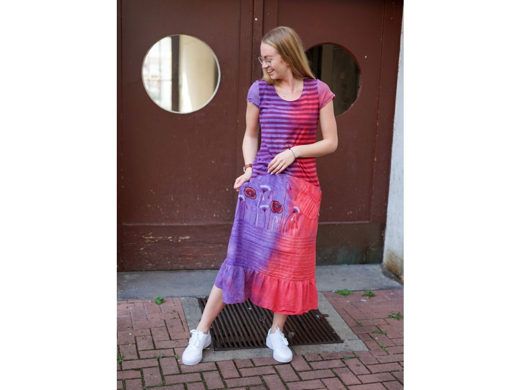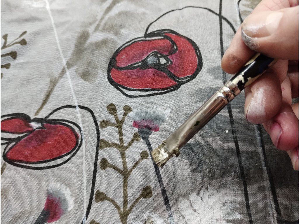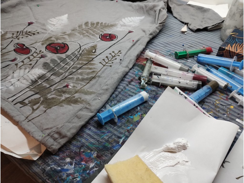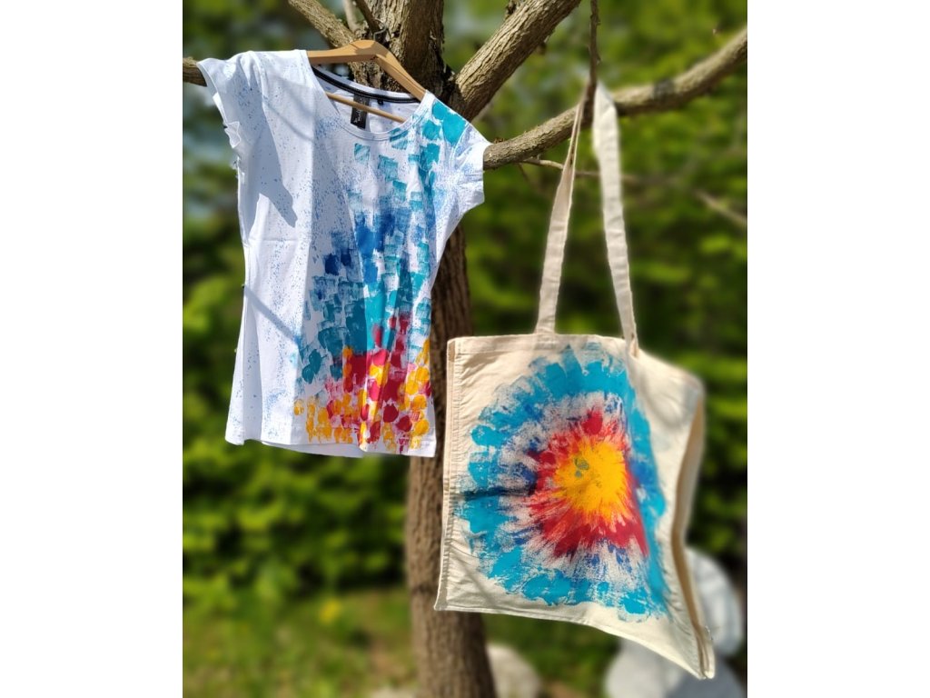 - Vlastní oblečení z domova, které chcete oživit malbou. Podmínkou je, aby bylo z přírodních materiálů (nejlépe bavlna, len, viskóza nebo jejich směsi) a ideálně světlejších odstínů – na tmavém podkladu barvy méně kryjí, ale lze pomalovat i třeba džíny.